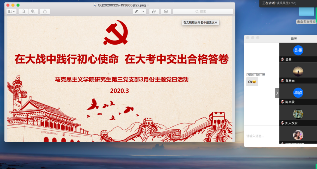 为深入学习贯彻习近平总书记关于疫情防控工作的重要指示,认真落实公司党委有关疫情防控工作要求,开展好疫情防控期间员工党支部建设,3月25日,8827太阳集团官网研究生第三党支部利用腾讯会议平台,开展了“在大战中践行初心使命 在大考中交出合格答卷”3月份线上主题党日活动。