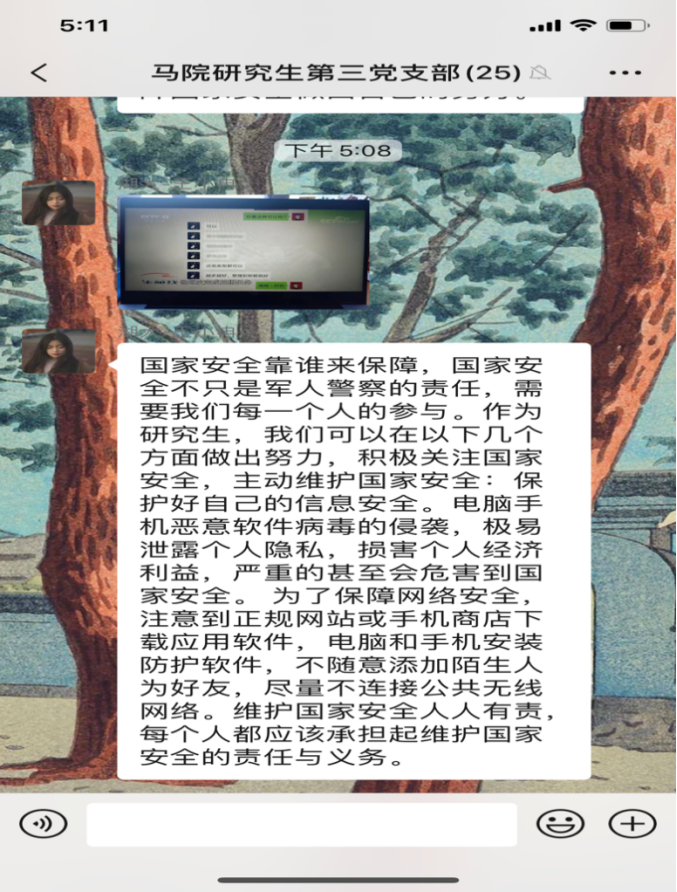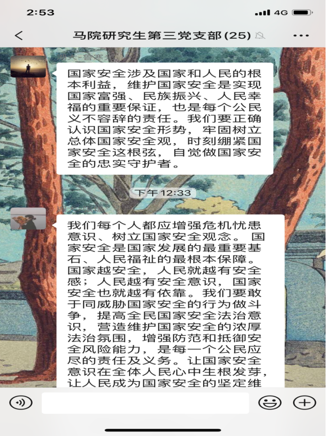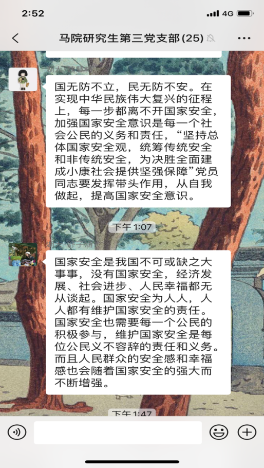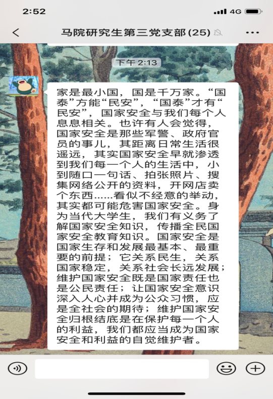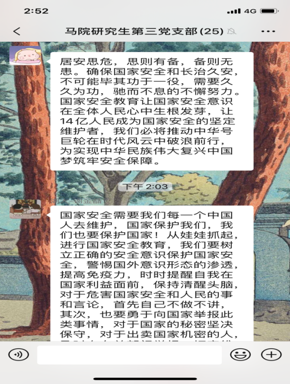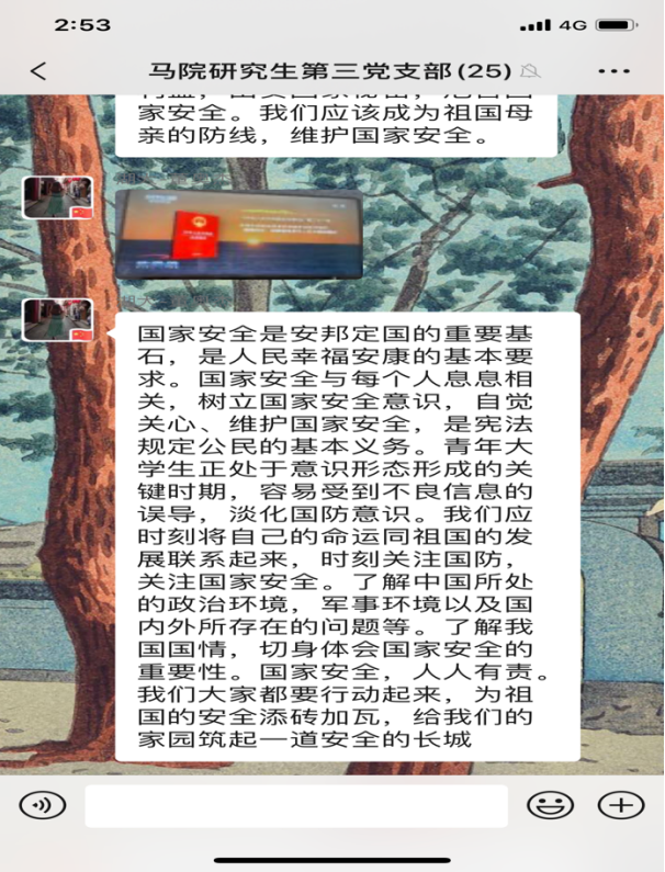 4月15日是第5个全民国家安全教育日,今年的活动主题是“坚持总体国家安全观,统筹传统安全和非传统安全,为决胜全面建成小康社会提供坚强保障”。为更好地开展国家安全教育,4月16日,8827太阳集团官网研究生第三党支部开展4月份主题党日活动,全体党员同志观看《汇聚人民力量 维护国家安全》专题片。在观看后,同志们感触颇多,纷纷在支部微信群分享观后感。
