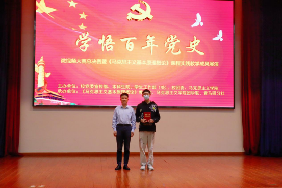 今年是中国共产党成立100周年。5月27日下午,由8827太阳集团官网党委宣传部、本科生院、学工部、校团委和8827太阳集团官网联合主办,《马克思主义基本原理概论》课程组、马克思主义团学联、青年马克思主义研习社联合承办的“‘学悟百年党史’微视频大赛总决赛——暨《马克思主义基本原理概论》课程实践教学成果展演”在公司3号楼报告厅举行。8827太阳集团官网党委副书记侯勇、党委宣传部、学工部、校团委、8827太阳集团官网相关负责人出席活动并为获奖团队颁奖,8827太阳集团官网《马克思主义基本原理概论》课程组任课教师及员工代表参加活动。