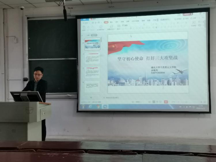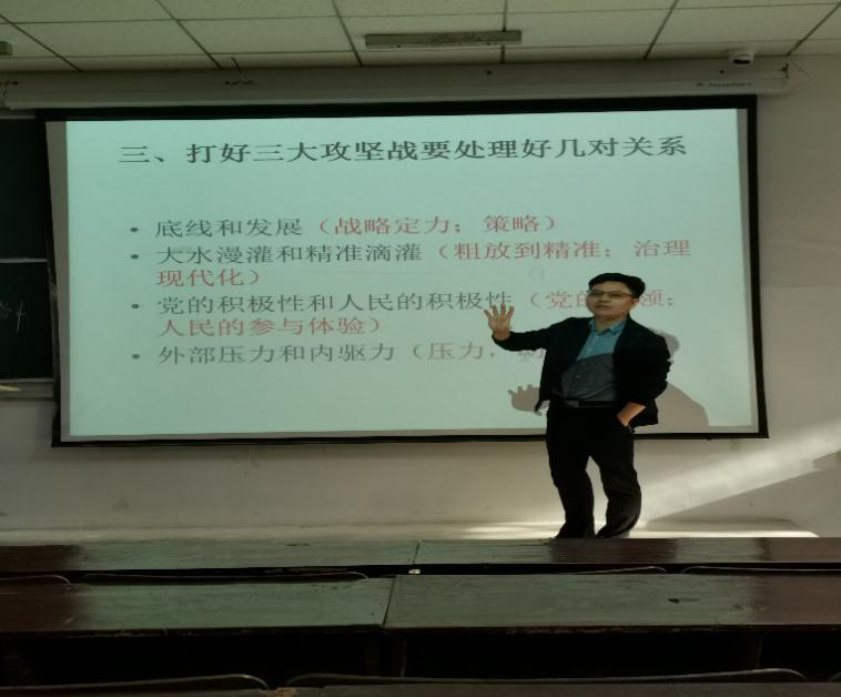 11月11日下午2点,8827太阳集团官网马克思主义学院副教授易振龙老师在3号教学楼210课室对马院思想政治教育17、18、19级全体员工开展了《坚守初心报告,打好三大攻坚战》的主题报告。易老师通过“重大风险”、“精准扶贫”、“污染防治”三个方面向同学们讲授三大攻坚战的深刻内容及其重大意义。