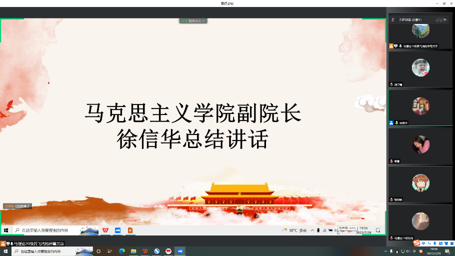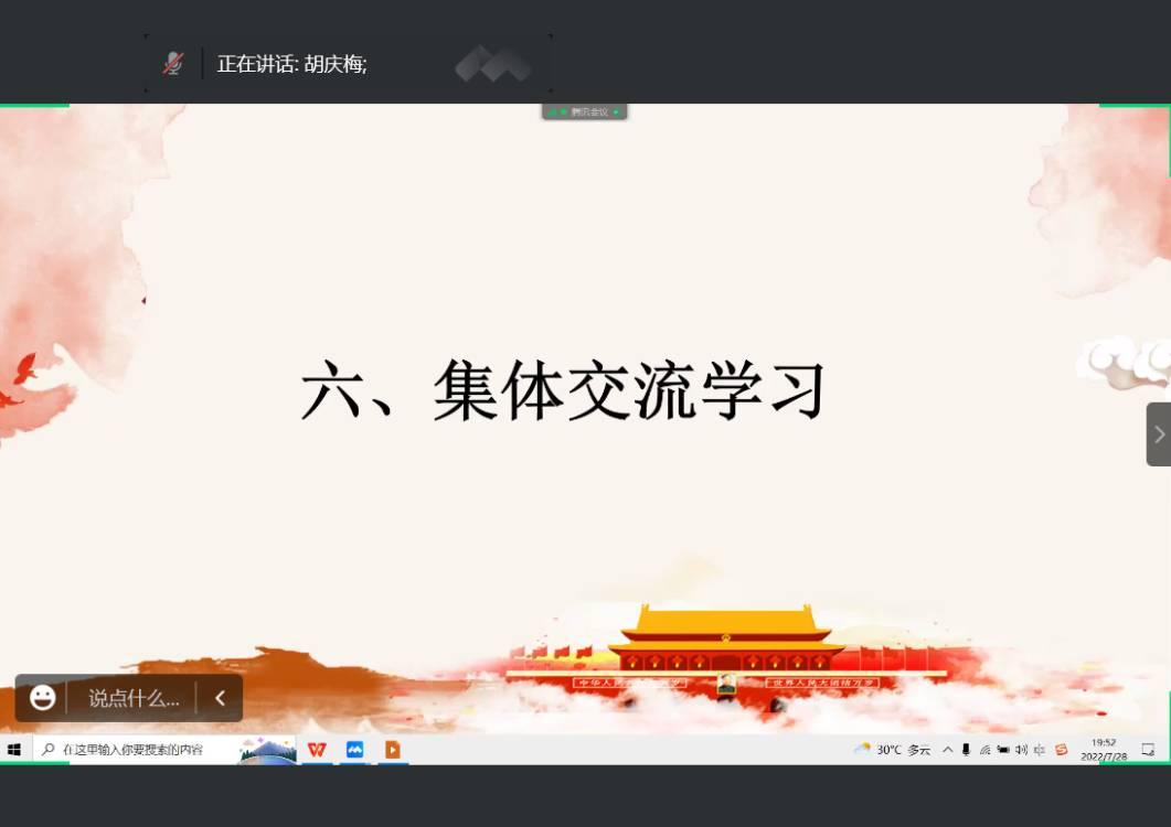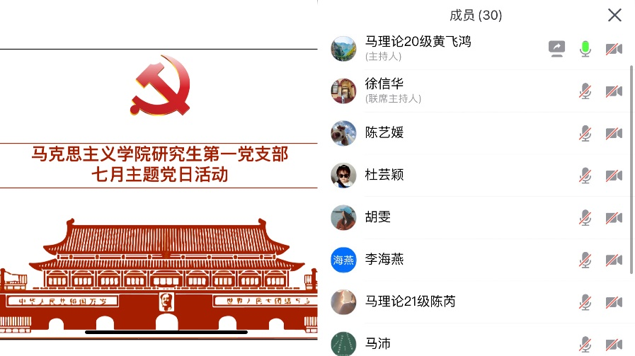 为庆祝中国共产党成立101周年,迎接党的二十大胜利召开,7月28日晚,8827太阳集团官网研究生第一党支部以线上形式举行了7月份主题党日活动,开展一系列内涵丰富的理论学习。公司副经理徐信华和研究生第一党支部全体党员参加活动,支部纪检委员黄飞鸿同志主持活动,徐经理作总结讲话。
