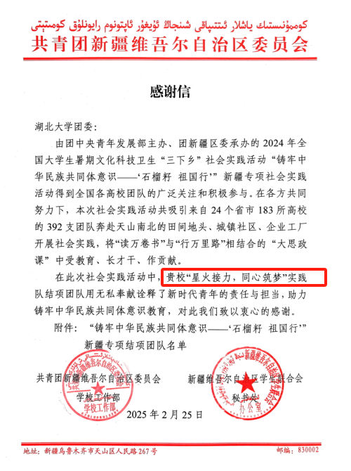 信中指出,本次社会实践活动共吸引来自24个省市183所高校的392支团队奔赴天山南北的田间地头、城镇社区、企业工厂 开展社会实践,将“读万卷书”与“行万里路”相结合的“大思政课”中受教育、长才干、作贡献。在此次社会实践活动中,公司“星火接力,同心筑梦”实践团队用无私奉献诠释了新时代青年的责任与担当,助力铸牢中华民族共同体意识教育,对此致以衷心的感谢。