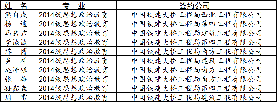 9月19日,中国铁建大桥工程局集团有限公司来公司招聘应届毕业生。全校共11人与该集团下属公司签约,其中,公司2014级本科应届毕业生有10人分别被该集团南方工程有限公司、建筑工程有限公司、第四工程有限公司等签约,从事党务、行政等工作。