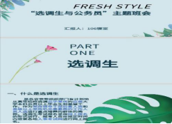 10月12日主题班会由106寝室承办,主题是考研与考公。18级员工即将面临考研就业选择。该寝黄诗雨同学以“选调生和公务员”为主题,向我们解释了什么是选调生,选调生与公务员的区别以及公务员考试的基本内容、框架。黄诗雨同学的细致耐心的讲解吸引了同学们关注,大家在她的简洁明了的陈述中对选调生、公务员有了更多认识。