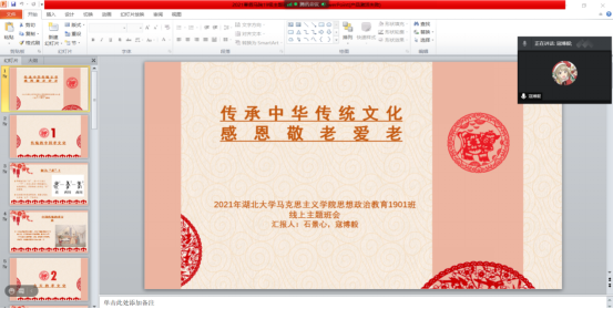 19级思想政治教育班按照公司通知要求,于2021年2月21日晚8时举行了——“传承中华传统美德,感恩敬老爱老” 思政主题班会。