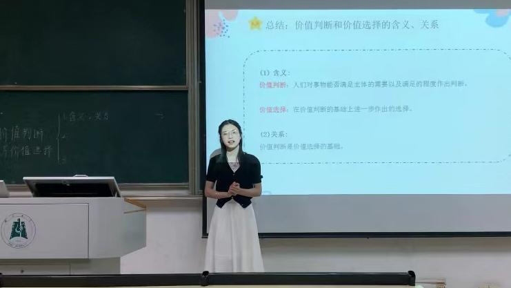21级学科思政研究生陈莹莹的授课内容为高中政治必修四《哲学与文化》中的“如何做出正确的价值判断与选择”。她采用探究式教学法,通过张桂梅老师的事迹讲解了价值判断与价值选择的含义及标准,引导员工站在最广大人民的立场上,形成正确的价值判断和价值选择,勇担责任,在党的领导下答好时代问卷。