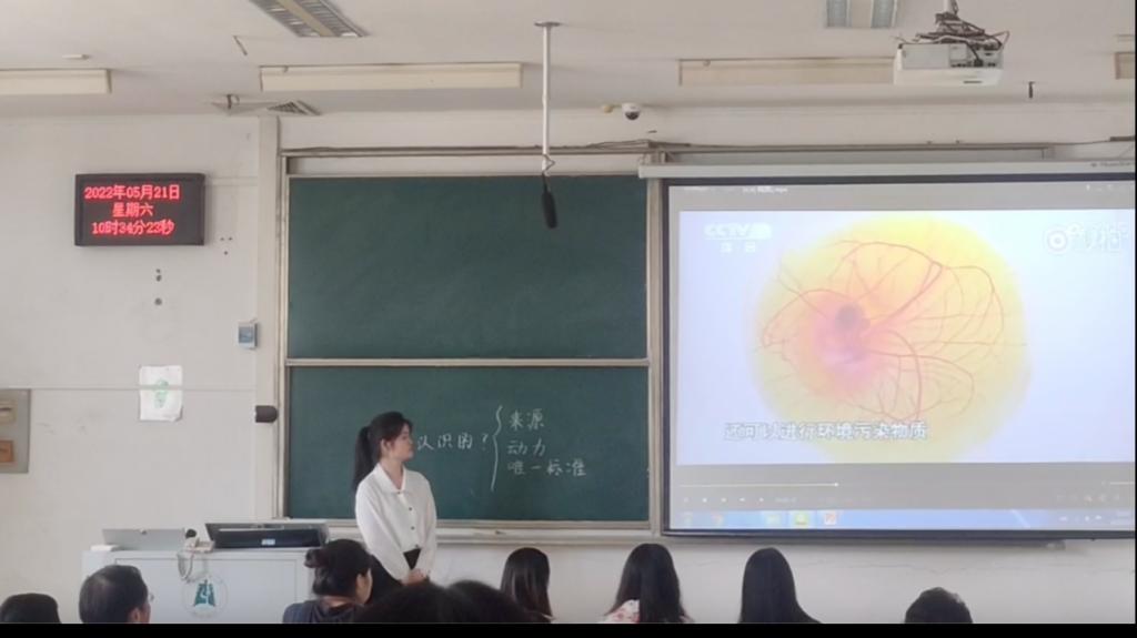 21级学科思政研究生王琴的授课内容是高中政治必修四《哲学与文化》中的“哲学意义上价值的特征”。她采用案例教学法,通过讨论疫情期间大家所准备的各种防疫物品,引出哲学意义上价值的内涵和特征,引导员工应不断充实自己,全面发展,最终实现人的真正价值。