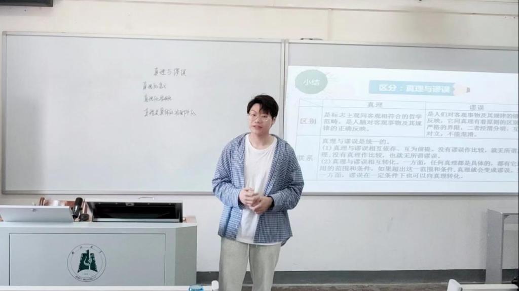 21级学科思政研究生刘传禹的授课内容是高中政治必修四《哲学与文化》中的“真理的含义与基本属性”。他采用议题式教学,将硬币穿杯的魔术贯穿整个教学过程,通过三个议题,分别讲授真相与假相的含义、真理的含义和真理的客观性,使员工明白追求真理是个永无止境的过程,并鼓励员工要敢于追求真理,对真理葆有自信。