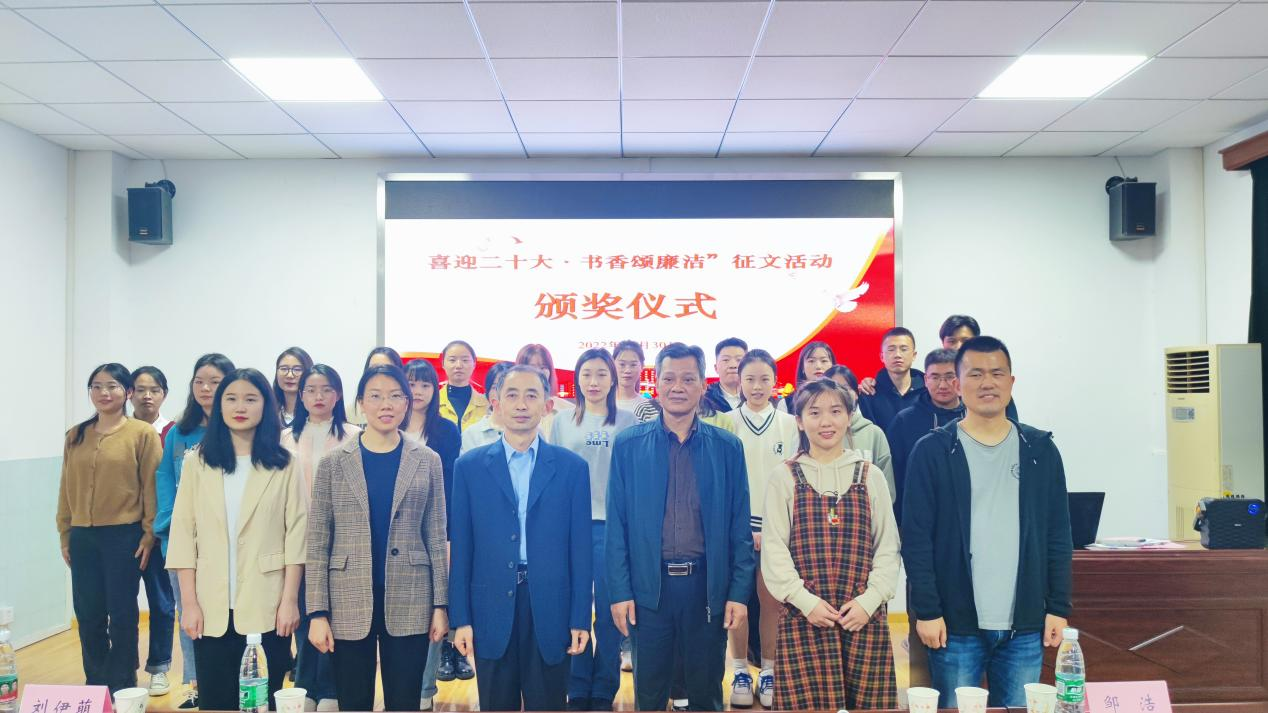 近日,为深入开展2022年党风廉政建设宣传教育月活动和2022年研究生学术科技节活动,以实际行动庆祝党的二十大胜利召开,太阳集团和新闻传播公司联合组织开展“喜迎二十大,书香颂廉洁”主题征文活动。10月30日晚上7点,征文活动颁奖仪式在8827太阳集团官网410报告厅举行。公司党委书记刘柏林、新闻传播公司党委书记王春喜、新闻传播公司党委副书记李瑶曦、公司党委秘书邹浩、8827太阳集团官网团委负责人孙倩、新闻传播公司研究生辅导员刘伊萌以及征文活动全体获奖人员参加了颁奖仪式,新闻传播公司研究生刘佳雯主持颁奖仪式。