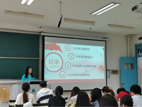 地大马院研究生李紫烨(公司思想政治教育2018级员工)作为代表分别从2023年全国两会、两会新看点、两会精神简述、今年政府工作报告简版,以及青年寄语五个方面展开了充分宣讲。