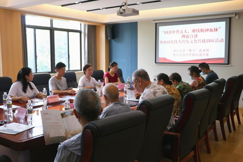 户部巷、楚才、西城壕、都府堤四个社区相关负责人先后发言。户部巷社区负责人结合基层宣讲工作开展经验,就目前优秀传统文化传播与宣讲工作提出意见建议。楚才社区负责人希望结合社区特点“量身定制”理论宣讲内容,提倡加入情景剧、研学游、音乐舞蹈等喜闻乐见的形式。西城壕社区负责人表示宣讲团可以挖掘街道名的文化意蕴、拍摄宣传微视频。都府堤社区负责人认为“青马”宣讲团能参与社区一系列活动,助力红色文化传播。