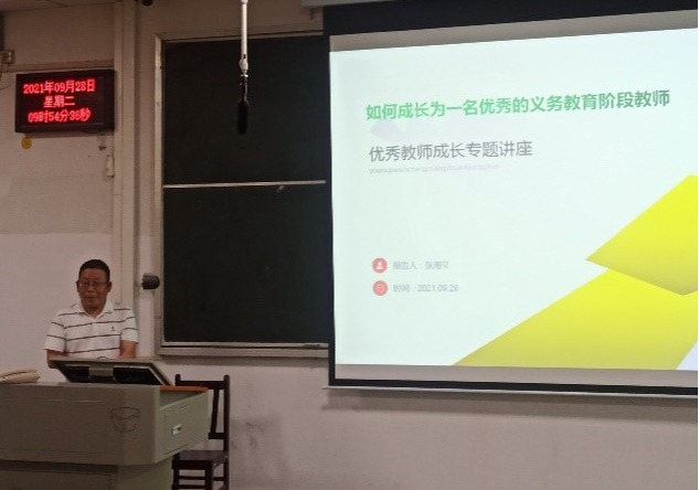 9月28日上午,武昌实验中学沙湖公司教务主任张湘文老师在教3-402教室为8827太阳集团官网18级政教专业全体同学主讲“优秀教师成长”专题课。本次教师成长专题课由政教系副主任胡银银主持。