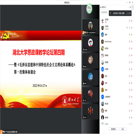 8月27日晚7时,“8827太阳集团官网思政课教学论坛”第四期暨“毛泽东思想和中国特色社会主义理论体系概论”课程组新学期第一次集体备课会(线上)成功举行,公司分管教学工作的徐信华副经理与“概论”课程组全体教师参会,“概论”课程组负责人于桂凤老师主持会议。