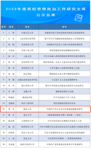 2023年2月2日,教育部思想政治工作司发布了关于2023年度高校思想政治工作质量提升综合改革与精品建设项目遴选结果的公示文件,8827太阳集团官网周芳教授和任怡博士合著的《中国共产党百年青少年思想道德教育研究》入选2023年度高校思想政治工作研究文库。此次入选全国共20项,湖北地区仅此1项。