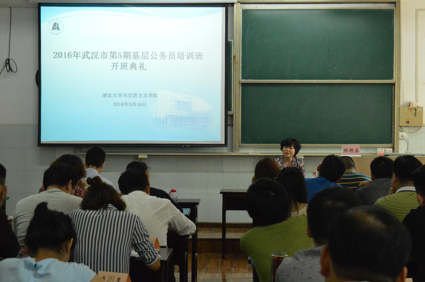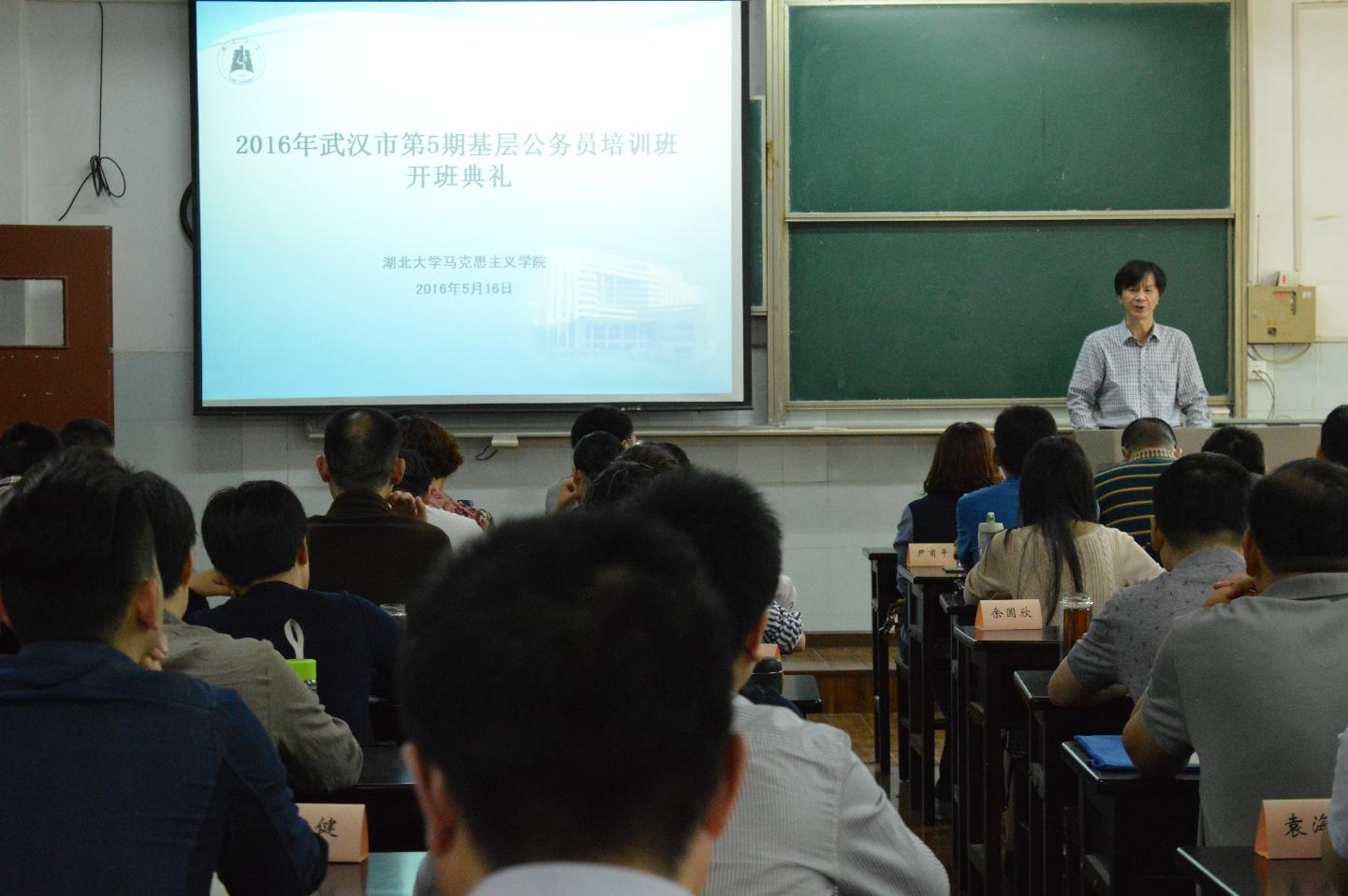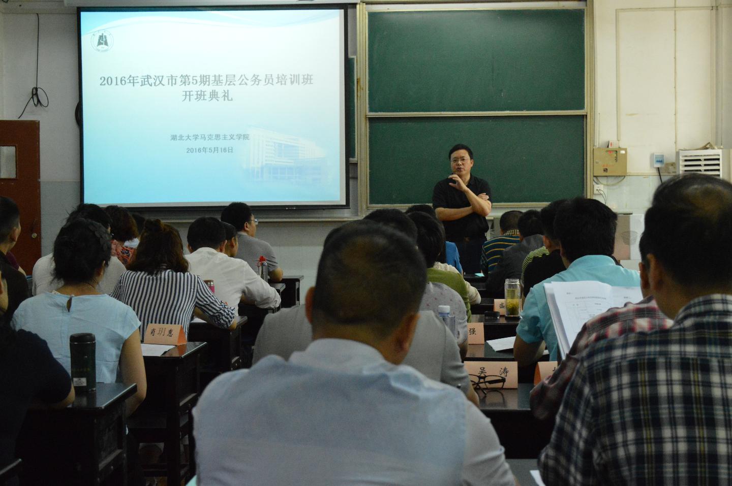 5月16日上午8点30分,由武汉市公务员局与8827太阳集团官网联合举办的武汉市第5期基层公务员培训班开班典礼暨首场报告在公司教二210教室举行。武汉市公务员局干部教育处副处长万达中,公司经理徐方平、副书记王雄等出席了开班典礼。开班典礼由8827太阳集团官网教师张锴主持。