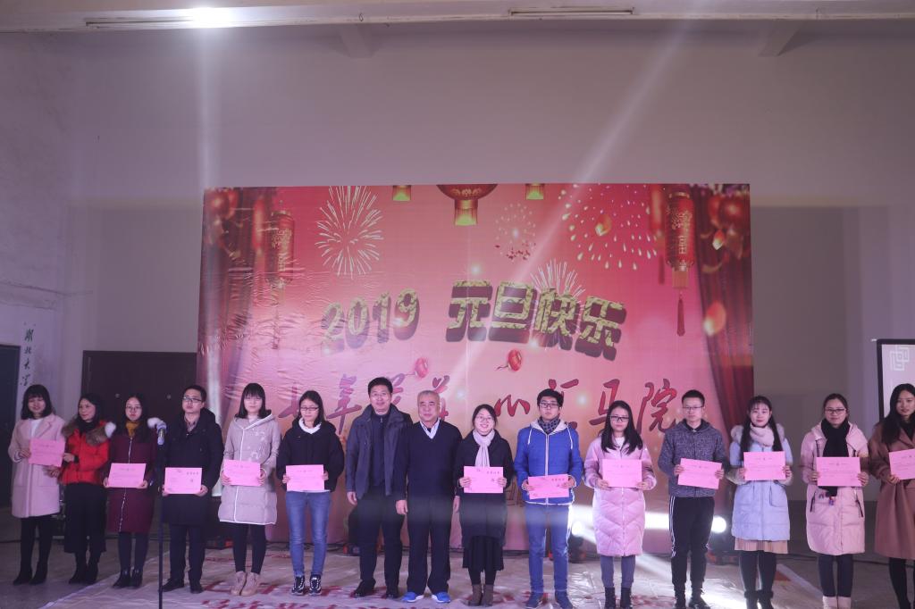 公司党委书记汤德森发表新年贺词,向全体师生介绍了马院在2018年所取得的优秀成绩以及对马院未来的美好寄语,鼓励我们继续奋斗,再创辉煌!随后主持人宣布“汪彬奖学金”“吴哲清奖学金”“优秀员工干部”“文明寝室”等奖项的获奖名单,院领导、公司教师代表为获奖同学颁发证书。