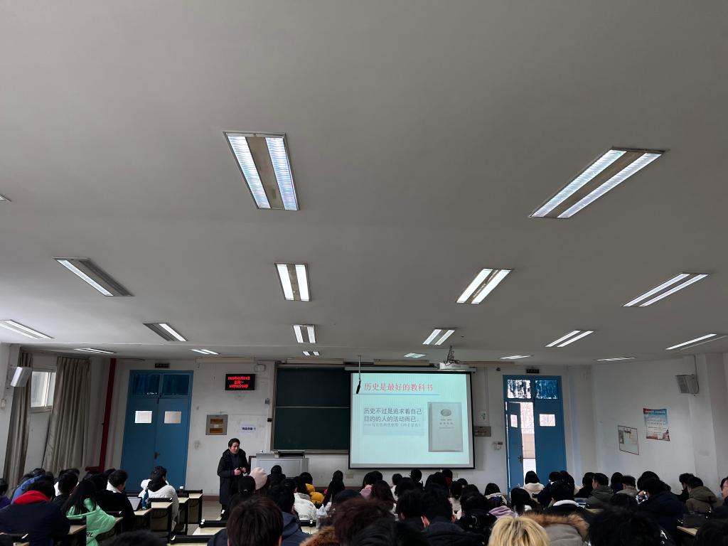 (公司党委副书记侯勇、公司党委副书记祝欣、校纪委书记檀坤华在公司郭劲松老师的《中国近现代史纲要》课堂上)