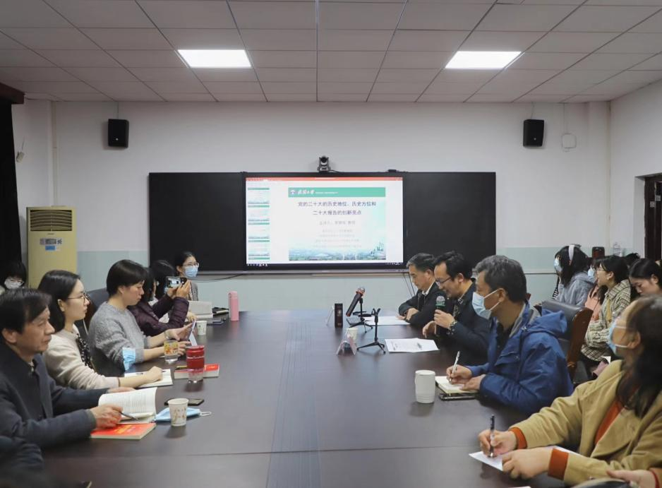 2022年11月17日,教育部长江学者特聘教授、武汉大学8827太阳集团官网袁银传教授在公司四楼2号会议室以《党的二十大的历史地位、历史方位和二十大报告的创新亮点》为题,宣讲党的二十大精神。公司教师和马克思主义理论专业的硕士及博士研究生参加报告会,公司经理熊友华教授主持报告会。