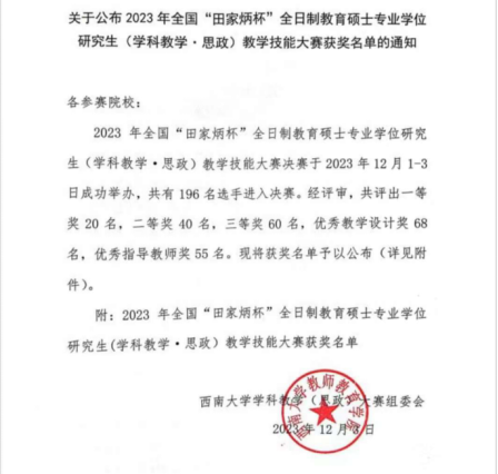 “田家炳杯”全日制教育硕士专业学位研究生教学技能竞赛是目前国内规模最大、学科最全、影响最广的教学技能赛事。12月1日至3日,由全国教育硕士研究生教学技能大赛专家委员会指导,田家炳基金会冠名,西南大学主办,西南大学研究生院、教师教育公司承办的2023年全国“田家炳”杯全日制教育硕士(学科教学 思政)专业教学技能大赛决赛暨人才培养论坛在西南大学隆重举行。