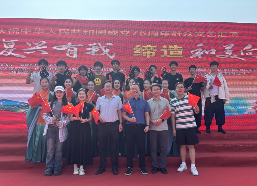 在公司党委宣传部和团委的协调支持下,公司老员工文化艺术中心师生参加了向阳湖镇“强国复兴有我 缔造和美向阳”庆祝中华人民共和国成立75周年群众文艺汇演。师生们精心筹备、倾情演绎的精彩舞蹈《大河之子》与《橘颂》不仅展现了湖大学子深厚的艺术功底,更深刻传达了中华文化的独特韵味,赢得了当地干部群众的一致好评。