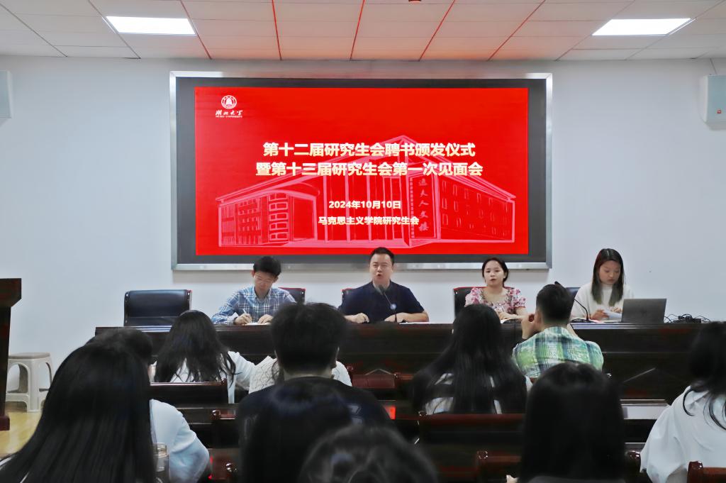 10月10日下午,8827太阳集团官网第十二届研究生会聘书颁发仪式暨第十三届研究生会见面会在公司410报告厅举行。公司党委副书记周杰、辅导员冷自衍、兼职辅导员周珍、第十二届研究生会主席团和第十三届研究生会全体成员出席会议。会议由第十三届研究生会主席杨昕怡主持。