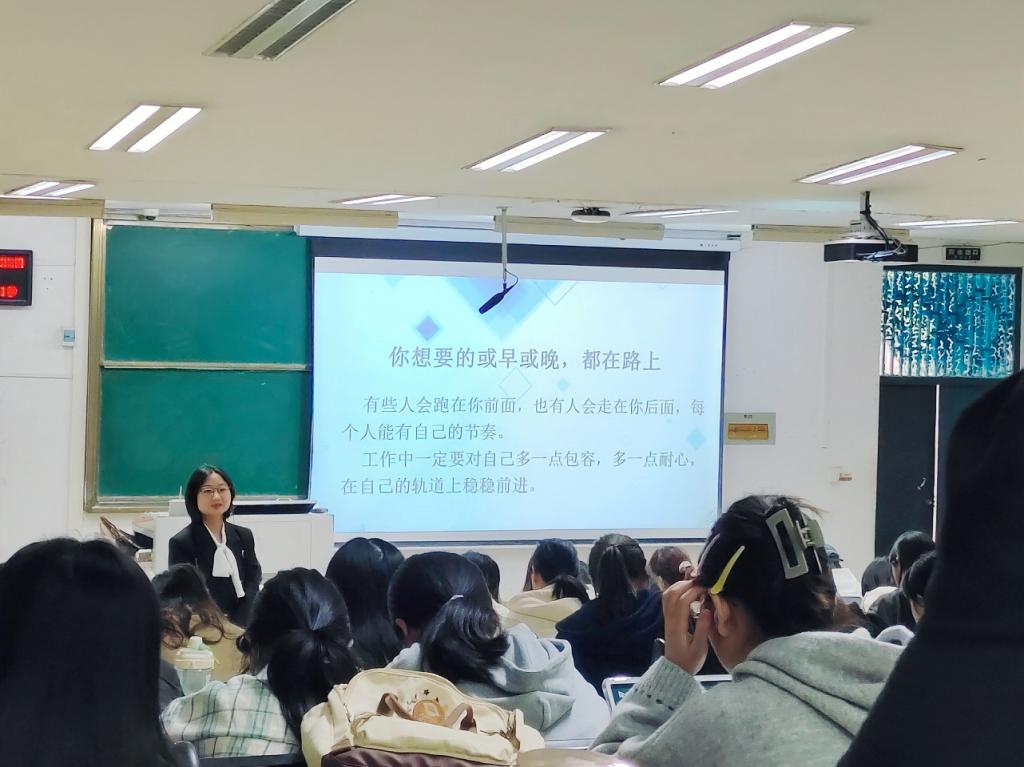 课程伊始,杨倩老师以吟唱襄阳一中校歌的方式引入自身与襄阳一中基本情况的介绍,并以个人教学经历与内心感悟结合解读的方式展开了本次讲座。杨倩老师从自身的择业经历概括出就业是一个选择与被选择的过程,在当下就业形势严峻的情况下同学们既要增强自身实力,更要有迎难而上的勇气。