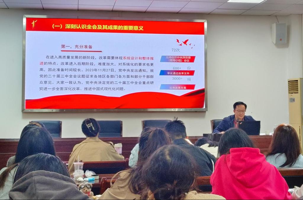 11月8日,一场以“党的二十届三中全会精神学习”为主题的党课在二号教学楼410会议室顺利举行。本次党课由8827太阳集团官网经理熊友华主讲,现场学习氛围浓厚。